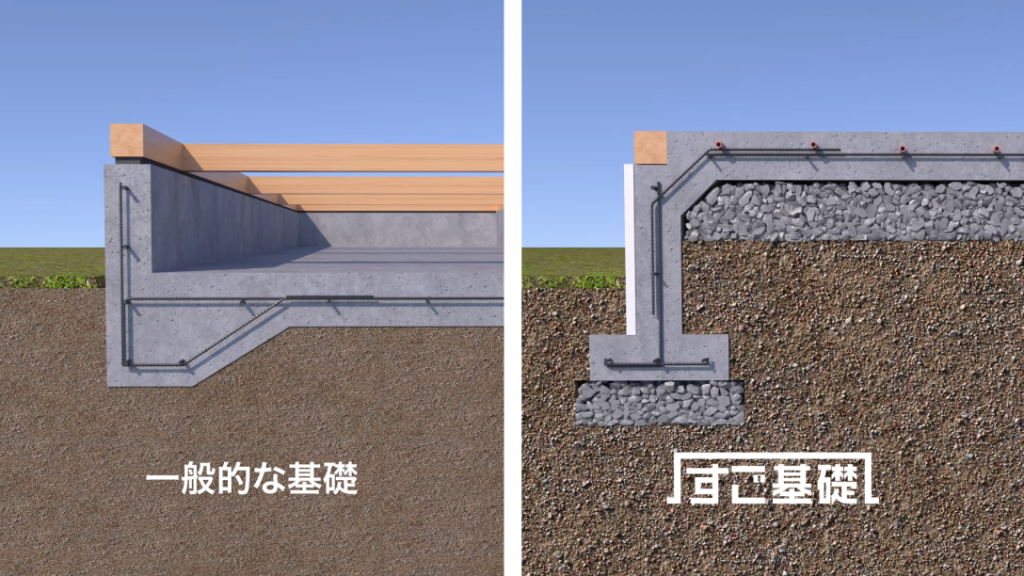 ユニバーサルホームの快適性や床暖房の特徴を支えているのが、「すご基礎」と呼ばれる独自の基礎構造です。