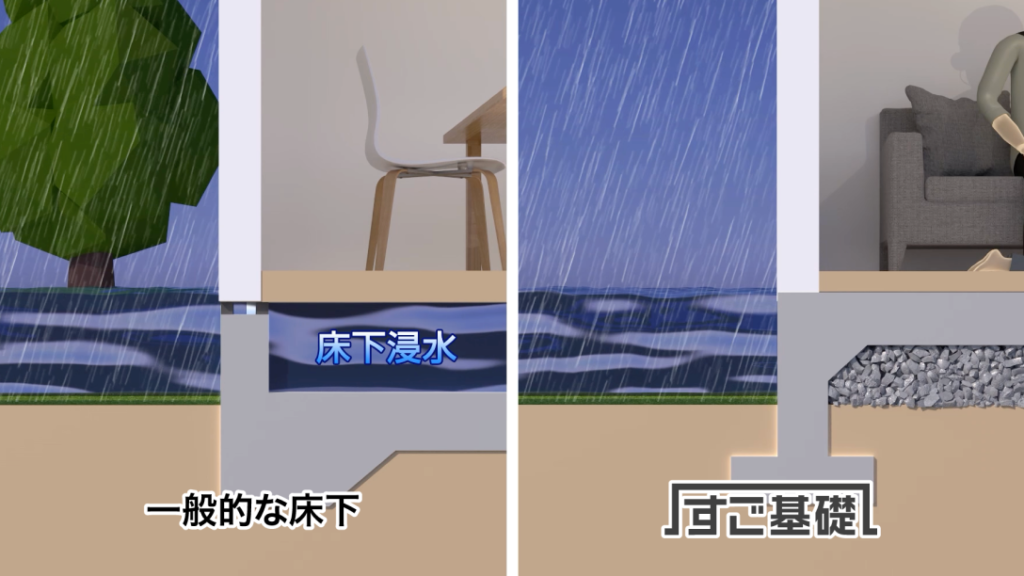 すご基礎は床下空間がないため、床下に水が入り込んで溜まるという状況が起こりにくい構造です。