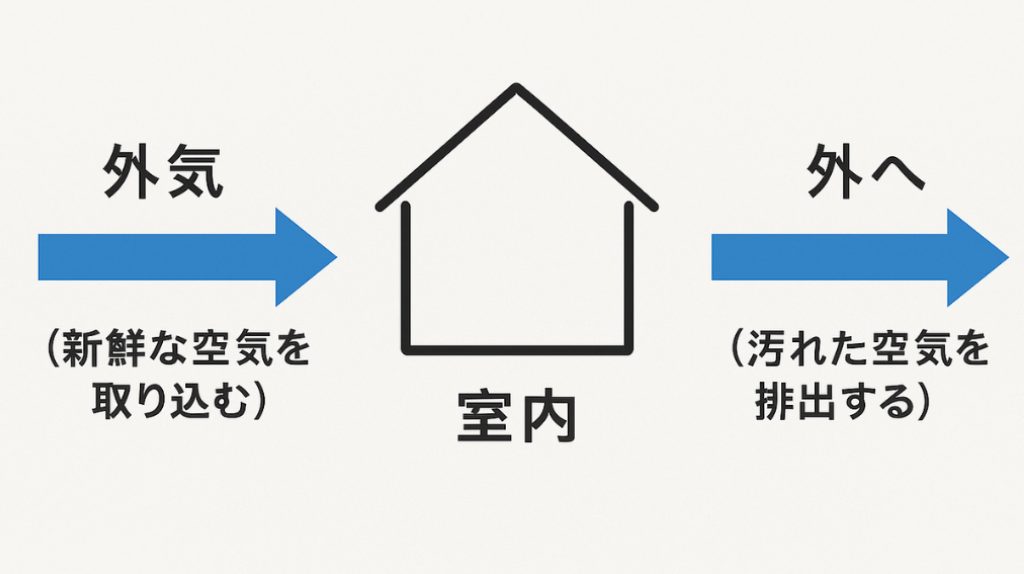 外気 →(新鮮な空気を取り込む)→ 室内 →(汚れた空気を排出する)→ 外へ