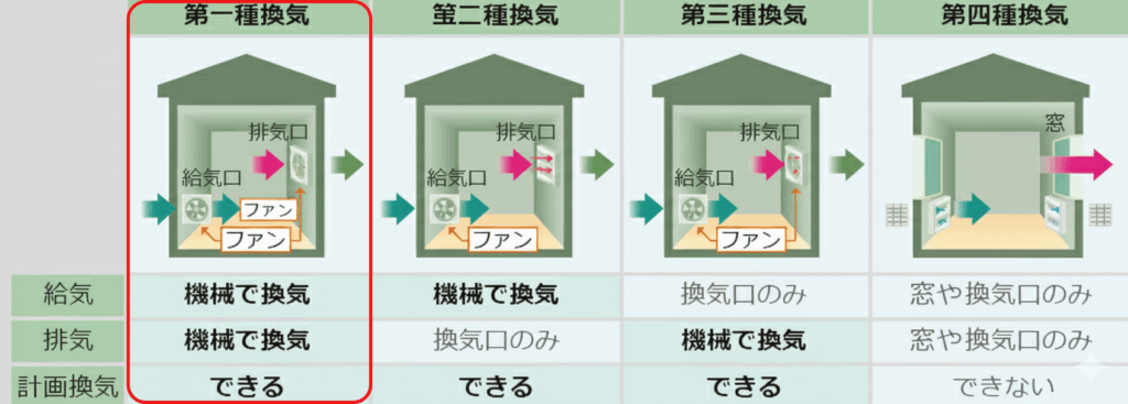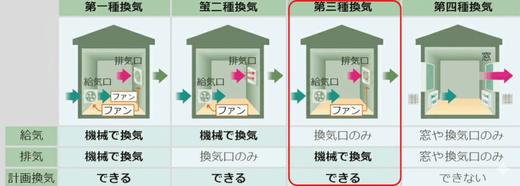 第2種は手術室やクリーンルーム、 第4種は現在ほとんど使われない方式のため、ここでは家づくりに関係する2つの方式に絞って解説します。